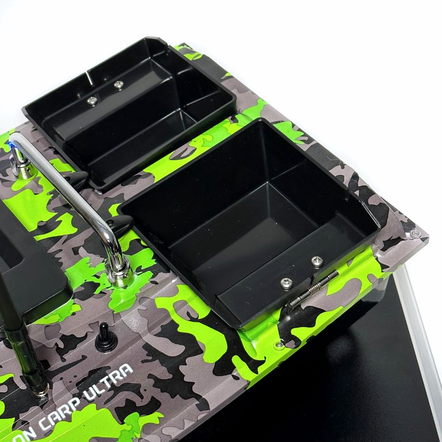 A hajó külseje egy neon terepszínt kapott, amitől az etetőhajó még minőségibb érzést képvisel. A hajó elején 2db fehér fény található, hátul pedig 2db kék, ami éjszaka nagyban megkönnyíti a hajó irányítását és messziről is látható. A hajón természetesen található egy tempomat gomb, amivel a hajót könnyedén gázadás nélkül tudjuk irányítani vagy akár rakhatjuk fel a swingert, miközben magától jön ki a hajó. A hajó a továbbfejlesztett hajtásnak köszönhetően képes egy helyben megfordulni, illetve egy (165000mah) akkumulátorral egy egész napot végighorgászhatunk.